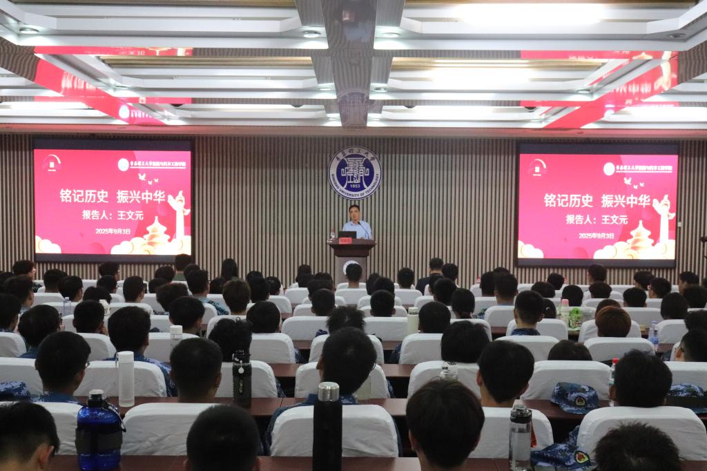 为纪念中国人民抗日战争暨世界反法西斯战争胜利80周年,引导广大青年学生铭记历史,开创未来,激励青年学子以奋进姿态投身民族复兴伟业,9月3日下午,hth华体育官网在主教学楼东报告厅举办《铭记历史 振兴中华》专题讲座。原临沂市政协常委、科技局局长、二级巡视员、现临沂激光产业链“红领书记”王文元担任主讲嘉宾,学院党委书记李忠晓主持报告会。2025级300余名新生在开学伊始,共同聆听了这场别开生面的思政第一课。