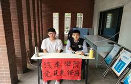 活动安排: 在新生开学期间,由学生二支部党员代表组成的党员先锋队早早的来到A112办公室、四五公寓楼前值班,帮助新生,默默地贡献自己的力量。党员先锋队的同学们不仅帮助新生报到,并主动为他们搬运行李,耐心地回答新生提出的每一个问题。不仅做好自己的本职工作,还用自己的热情,感染了每个刚到学校的同学,让他们在异乡感受到了家的温暖。同时,也为其他同学树立了榜样,起到了先锋模范带头作用。