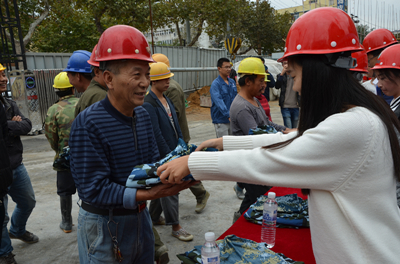仪式现场,主持人先致开幕词。紧接着,李尊强先生致辞,他指出,民工是社会关注的弱势群体之一,同学们的捐赠,不仅仅是用自己的爱心为军训服增添了新的光彩,更是用自己的爱心去温暖了广大民工朋友在异地他乡漂泊如浮萍般的心,让他们不在畏惧萧萧寒风,同时也是给广大民工朋友的最真挚的问候和关怀,在此向各高校组织表示由衷的感谢。紧接着出席的学生代表向民工朋友们发放军训服,随着学生代表发放军训服的脚步,温情也随之在寒冷的空气中弥漫、发酵,让凛冽的风不再刺骨,让寒凉的空气也变得温暖如春。