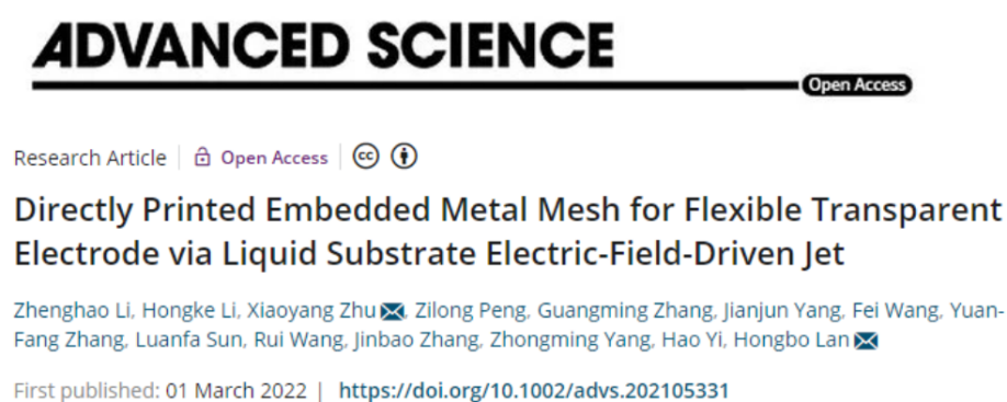 hth华体育官网3D打印团队在兰红波教授带领下,长期致力于微纳尺度3D打印这一前沿新兴技术、装备和工业化应用的研究与开发。在国内率先提出并开展了微纳3D打印技术和应用的研究,提出并建立了一种原创性的微纳增材制造新技术:电场驱动喷射沉积微纳3D打印;研制出国内首台具有完全自主知识产权的电场驱动喷射沉积微纳3D打印机。面向世界科技前沿和国家重大需求,近年提出先进电子与电路微纳增材制造新技术,并在多个前沿和新兴交叉领域取得突破。目前在低频/宽频透明电磁屏蔽,透明电加热,曲面共形电子(曲面共形天线,曲面透明电磁屏蔽,智能蒙皮),5G天线,透明天线,陶瓷电路、高性能柔性/拉伸透明电极,3D结构电子及柔性混合电子等方面应用效果显著,部分研究成果已经在民口、军口等单位得到应用和转化,尤其是高性能透明电磁屏蔽及透明电加热玻璃已具备批量化生产能力。目前,团队已经在国内外顶尖期刊Advanced Materials、Advanced Science、Small、ACS Applied Materials & Interfaces、科学通报、中国科学、机械工程学报等发表高影响力论文50余篇,微纳尺度3D打印方面专利位居全球首位(2020年数据),团队为学校双高建设积极做出贡献。