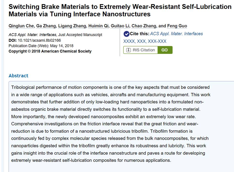运动部件的摩擦学性能是在车辆、飞机和制造设备等广泛应用中必须考虑的关键因素之一。本研究论文将硬质纳米颗粒加入到一种有机刹车材料中,直接实现材料功能转换,使刹车材料转变为极耐磨自润滑材料。更有趣的是,这种新型纳米复合材料的耐磨性比文献中所报道的自润滑材料要高得多。本研究工作提供了直接的证据,证明了一种纳米结构的界面转移膜的原位生长,它是由来自于基体材料不断提供的复杂分子与钢表面发生摩擦化学反应,形成一种新的鳌合物,从而解释了材料功能的转变机理。