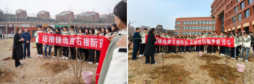 在图书馆西侧草地,老师们与各民族学生分组协作,挥锹铲土,共同栽下一棵棵石榴树,一起种下中华民族共同体意识的“树苗”。后勤管理处党总支书记王龙向在场学生说:“我们种植的这片石榴林,既是用劳动实践丈量知行合一的‘田间课堂’,更是将个人理想嫁接国家战略的‘成长苗圃’。新时代青年正如这满园石榴相拥成林,各学生如石榴籽般紧紧相拥,在共同浇灌的青春岁月里孕育出中华民族一家亲的参天大树!
