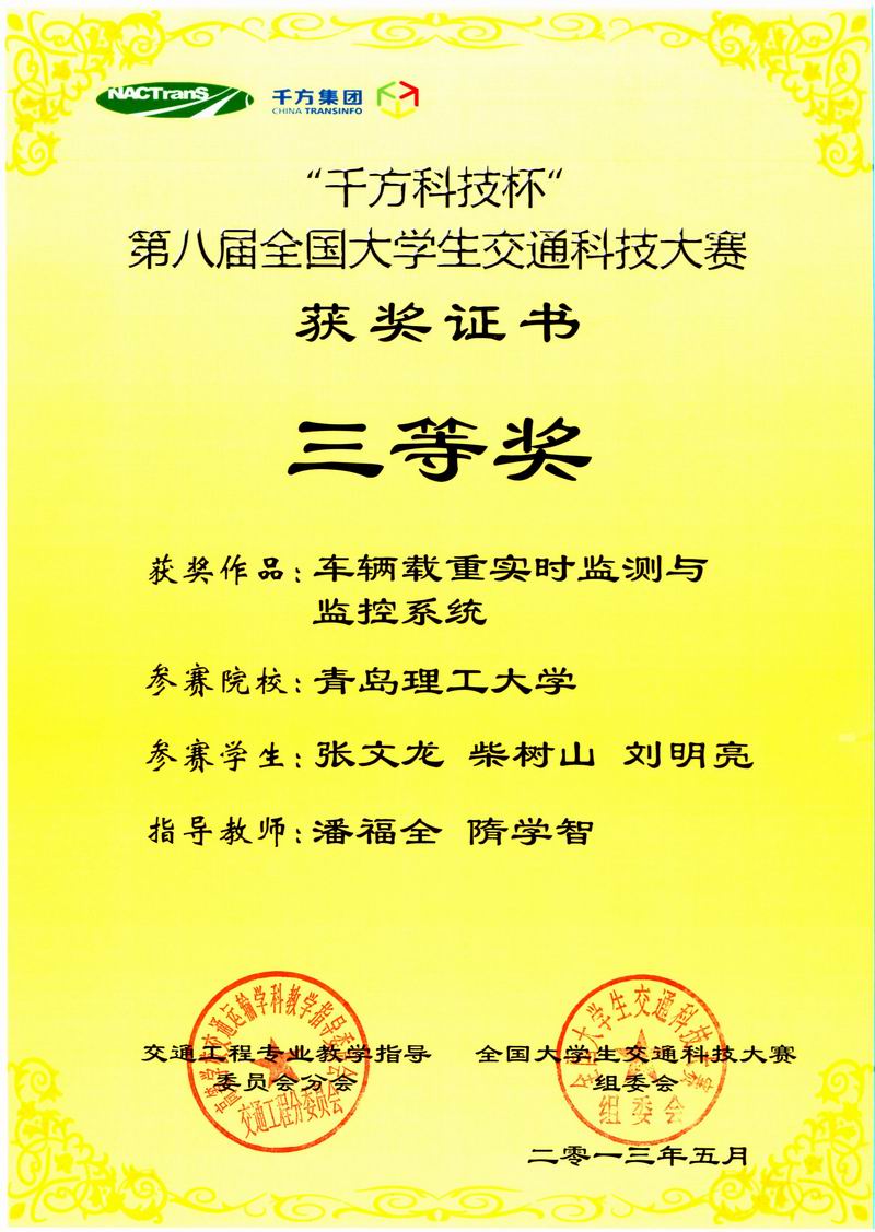 5月25日至26日,由教育部高等学校交通运输与工程学科教学指导委员会主办、北京工业大学承办,以“顺畅交通”为主题的第八届全国大学生交通科技大赛决赛在北京举行。本届大赛共有全国86所大学报名,198件作品参加选拔,经过专家组评审,仅有来自51所学校的80件作品进入决赛。hth华体育官网由潘福全、隋学智老师指导,张文龙、柴树山、刘明亮同学合作完成的《车辆载重实时监测与监控系统》荣获三等奖。