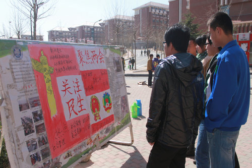 “两会”对过去一个时期的建设成就进行了认真总结,集中讨论了当前面临的形势任务和热点问题,关注社会民生,科学决策并审议通过了一系列深化改革,保障民生的决议法案。学习展前,同学们纷纷驻足观看,对两会主题内容及热点话题进行了讨论,表达了自己对两会胜利召开的喜悦心情。