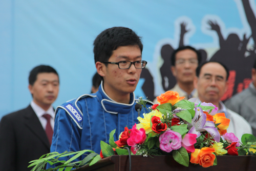 车队队长、大四学生王德盛介绍了车队组建过程,发表了造车感想,并对学校、学院领导老师的深切关怀与技术指导、社会各界与媒体的热切关注与大力支持表示衷心感谢。