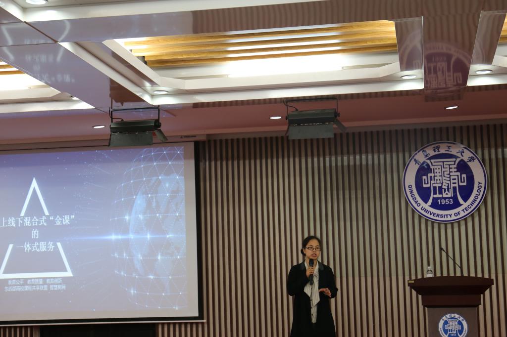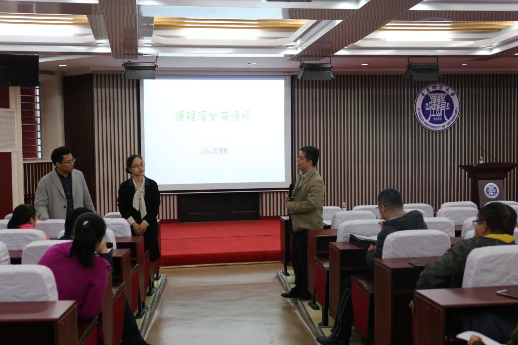 报告会的第二阶段,智慧树在线教育公司技术人员做了“线上线下混合式金课的一体式服务”报告,介绍了课程实际录播与应用要点。