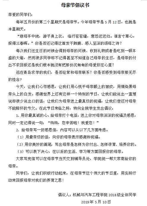 在母亲节前夕,2018级全体同学向全院同学发起倡议,提议母亲节当天,主动给自己的母亲打一个问候电话,向母亲深情告白,以简单质朴的方式来表达对母亲深深的敬意。大家把对母亲的思念或是想对母亲说的话写成一封信,由学院统一邮寄给母亲,表达对母亲真诚的祝福和感激。