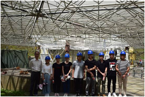 在FAST基地黄琳工程师的带领下,大家对500米口径球面射电天文望远镜进行了近距离的参观和考察。黄琳为师生们介绍了FAST设施从选址到建成再到投入使用的艰难历程,详细说明了FAST的结构构造、部件功能以及其对中国天文学发展和科学研究的重大意义。此次考察安排在FAST设备检修期间,师生们可以零距离接触馈源舱、反射面和索网等FAST设备设施。在随后的座谈和学术交流活动中,师生们向基地领导和技术人员汇报了FAST三维可视化建设项目的进展情况,大家就FAST三维建模需求、数据采集、可视化功能展示等相关问题进行了讨论。