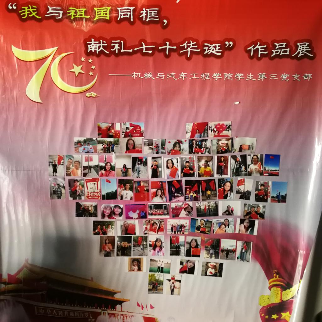 国庆前,党支部面向广大师生发布活动通知,广大师生在自己的学习工作岗位上争相与国旗同框,表白祖国、歌唱祖国、祝福祖国,一面面鲜艳的五星红旗表达了支部成员对伟大祖国的深切热爱。经过半个月的作品征集,共收集与国旗同框合影照片249张,祝福视频11份,寄语33篇,每张照片和寄语都表达了对祖国浓浓的爱与祝福。最终经过评选,选出70张优秀作品张贴在精心设计的海报上,晒出对伟大祖国浓浓的祝福。