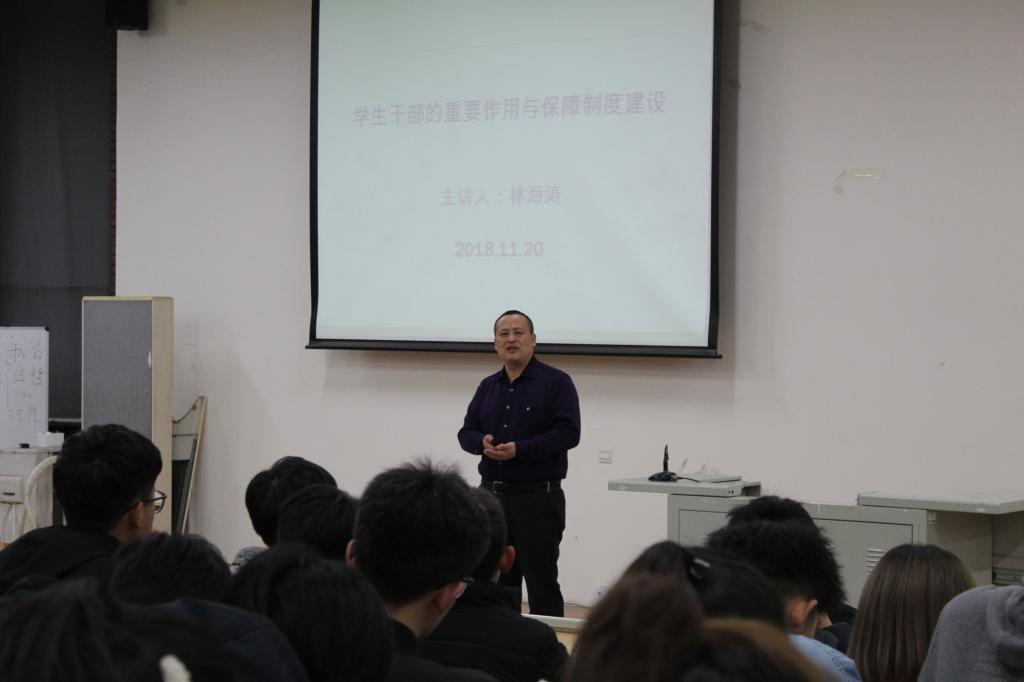 培训会上,林海涛进行了“学生干部作用发挥”培训。他强调学生干部作用发挥机制应主要从选拔任用机制、培养使用环节、监督激励制度和形成团队效应四个方面入手,只有牢牢地把握住这四个方面,才能建立一支有胸襟、有毅力、有效率的学生干部团队。他指出,学生干部对大家不仅是一种历练和机会,更是一种责任和义务,大家应有大局意识和宽阔视野,不忘初心,牢记使命,努力成为一名优秀的学生干部并最终成为祖国的栋梁之才。