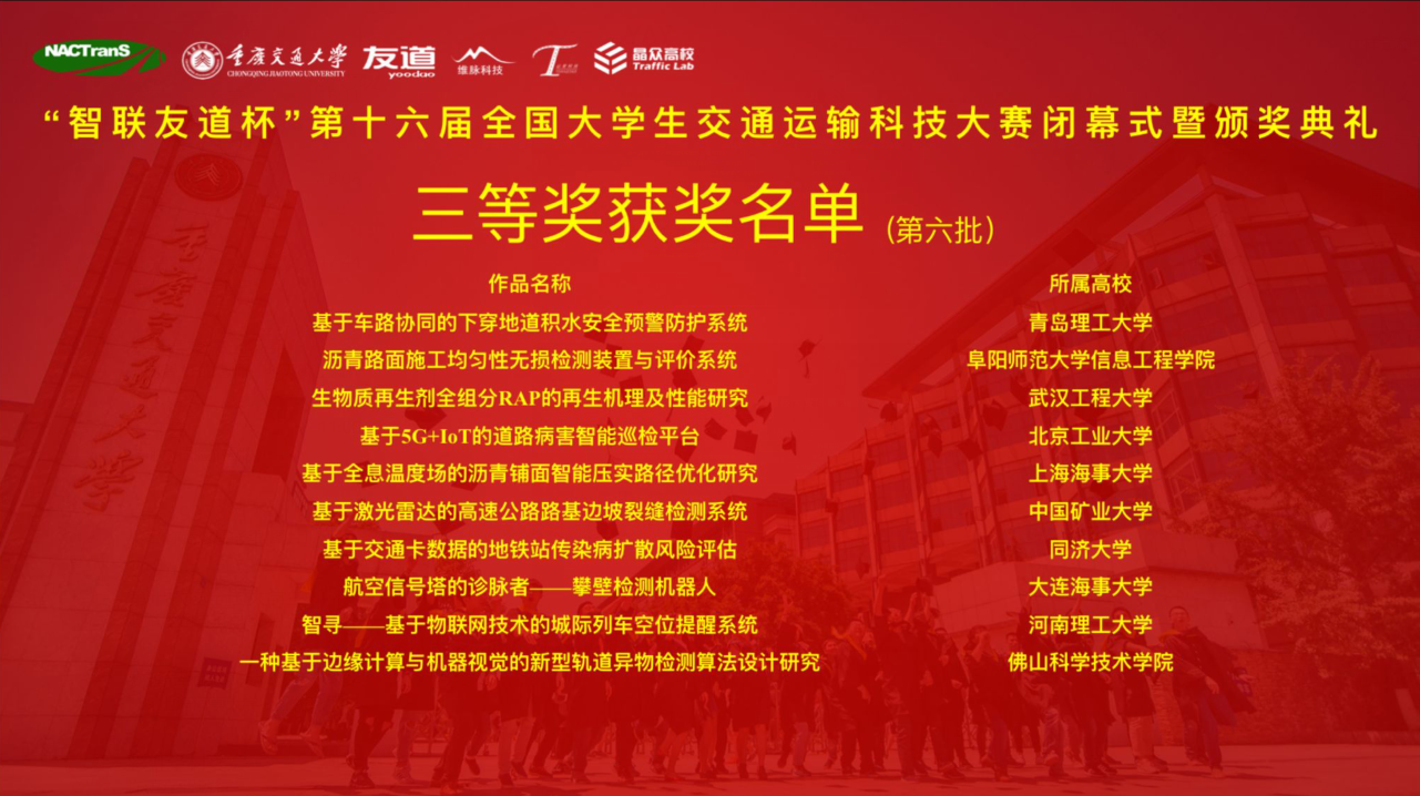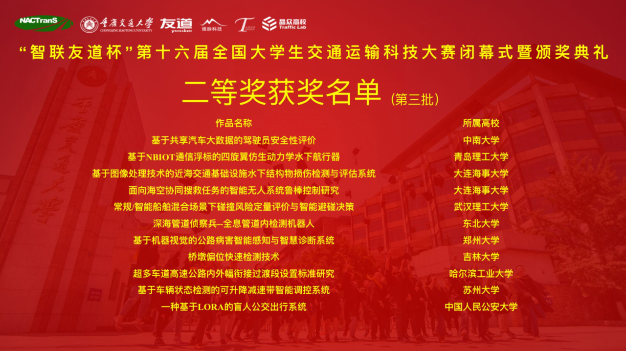 2021年7月24日-25日,“智联友道杯”第十六届全国大学生交通运输科技大赛在重庆交通大学落下帷幕。hth华体育官网选派的hth华体育官网2支队伍入围决赛,最终取得了二等奖1项、三等奖1项的优异成绩。
