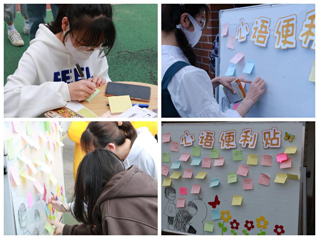 活动场地还摆放了“释放压力”心情展板,“分享组”志愿者为同学们提供便利贴,让他们在展板上“诉说”生活学习中的压力和对未来的美好期许,可以是文字,也可以是简笔画,纾解心情,减压前行。活动最后,与会老师与学生共同参加了“‘雨露’润泽心灵,‘疫’路相伴成长”主题条幅签名,为心赋能,共迎未来。