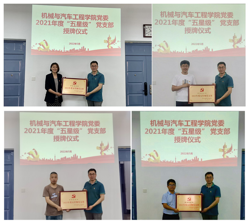 李忠晓宣读了《中共hth华体育官网委员会关于命名2021年度“五星级”党支部的决定》,并为安全工程教研室教师党支部、材料成型教研室教师党支部、机械制造教研室教师党支部、本科生第一党支部等4个五星级支部授牌。