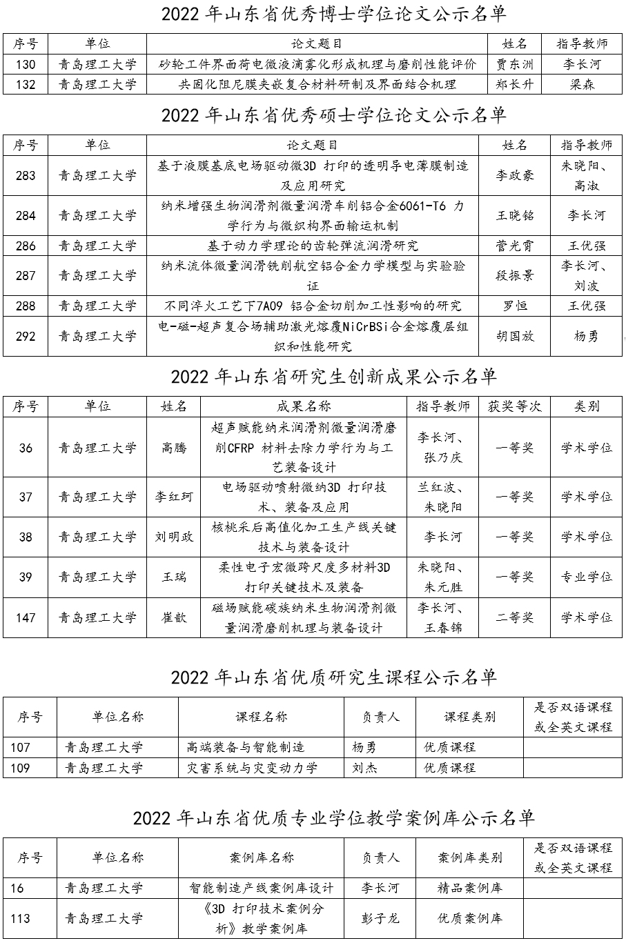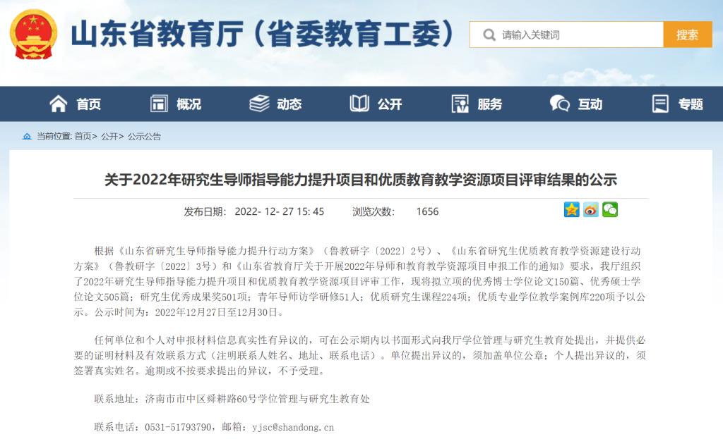 据悉,2022年研究生导师指导能力提升项目和优质教育教学资源项目评审工作是山东省教育厅根据《山东省研究生导师指导能力提升行动方案》(鲁教研字〔2022〕2号)、《山东省研究生优质教育教学资源建设行动方案》(鲁教研字〔2022〕3号)和《山东省教育厅关于开展2022年导师和教育教学资源项目申报工作的通知》要求组织的。本次评审共拟立项优秀博士学位论文150篇、优秀硕士学位论文505篇;研究生优秀成果奖501项;青年导师访学研修51人;优质研究生课程224项;优质专业学位教学案例库220项。