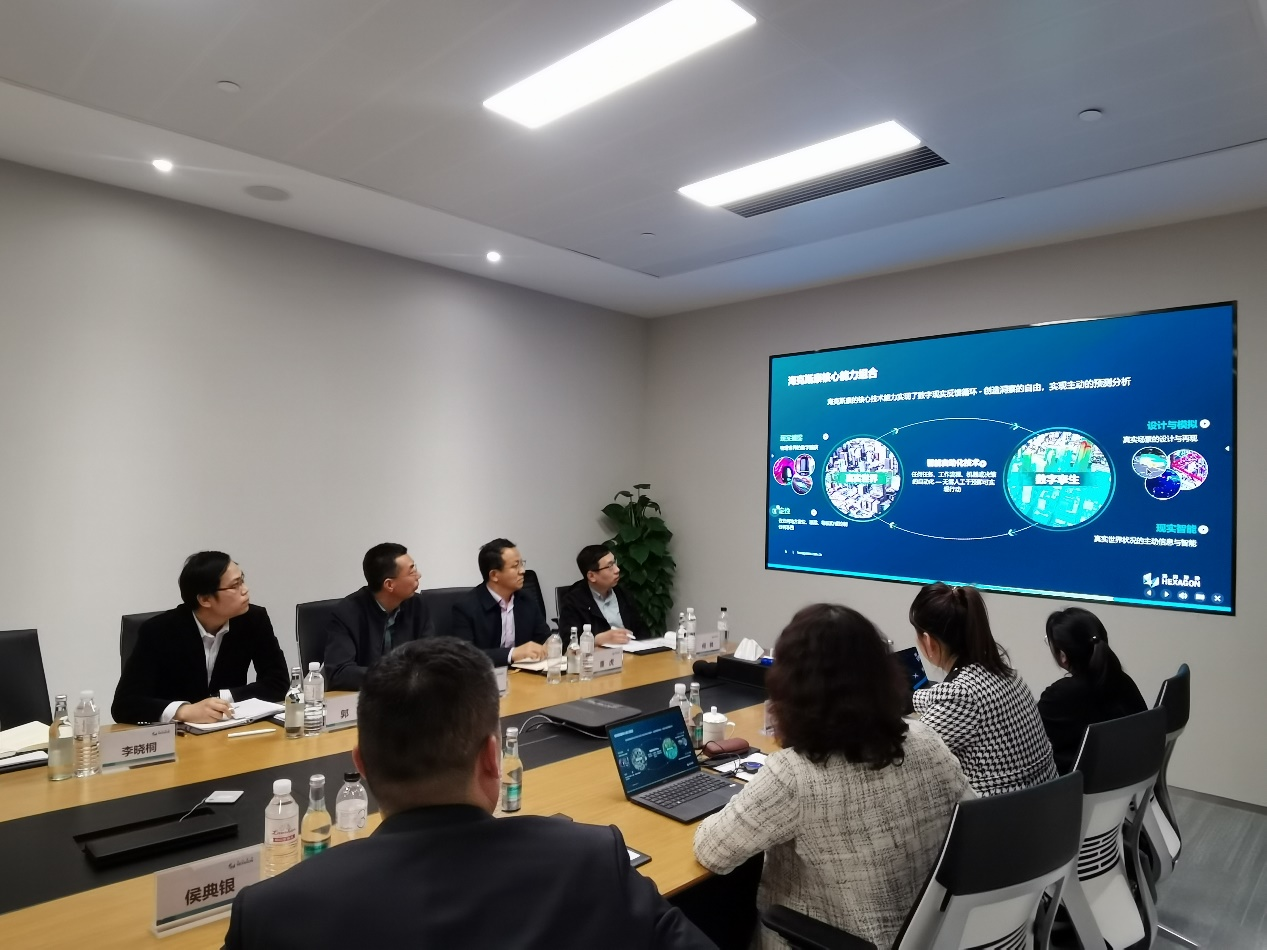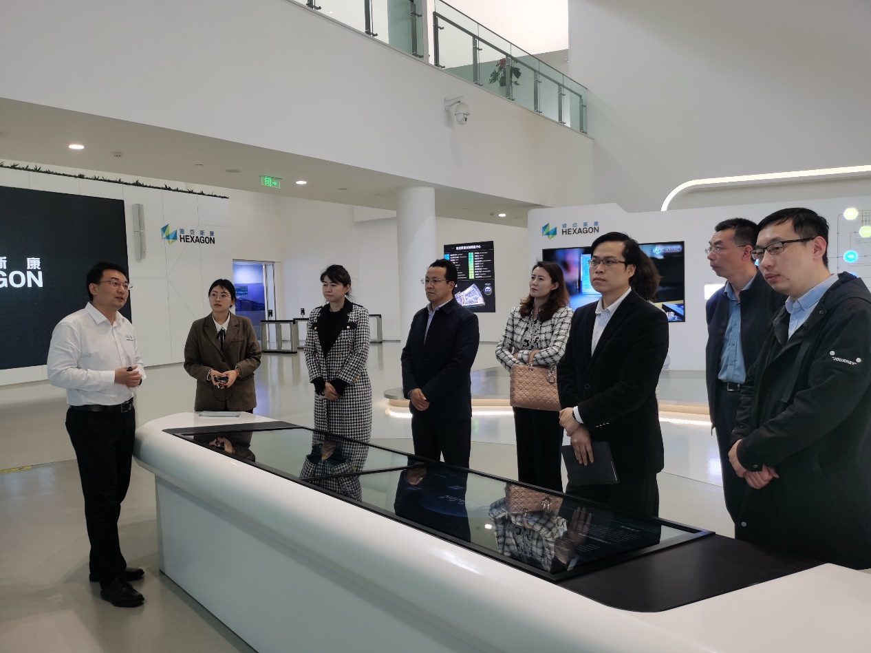牟永川一行在海克斯康教育产业总经理廖鲁等人的陪同下,先后参观了“双智”展示空间和智慧园区运营中心,全面了解了公司的企业文化、主营产品和技术实力,随后,双方就产学研合作、学生就业创业等方面进行了座谈。
