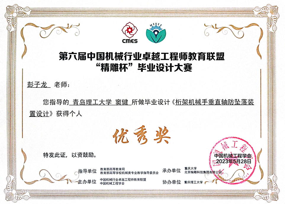 此次“精雕杯”毕业设计大赛,学校共申报参赛13个项目,共获得中南部赛区二等奖1项,三等奖4项。其中来自hth华体育官网-潍柴现代产业学院的参赛作品“桁架机械手垂直轴防坠落装置设计”获得中南部赛区二等奖,晋级决赛(学生:窦健,指导教师:彭子龙、大国工匠王树军、杨德仁)。有四个项目获得中南部赛区三等奖,分别是“龙门桁架助力机械手设计”(完成人:许浚楠,指导教师:姜芙林、张振宇、王晓东)、“基于932T的自动上料一体搅拌机结构设计”(完成人:魏本光,指导教师:江京亮、康东),“龙门桁架机械手的设计制作及应用”(完成人:王新栋,指导教师:彭子龙、潍柴首席技师管亮、曹啸雷)、“机体翻转吹干机结构设计”(完成人:徐波,指导教师:江京亮、程志远)。