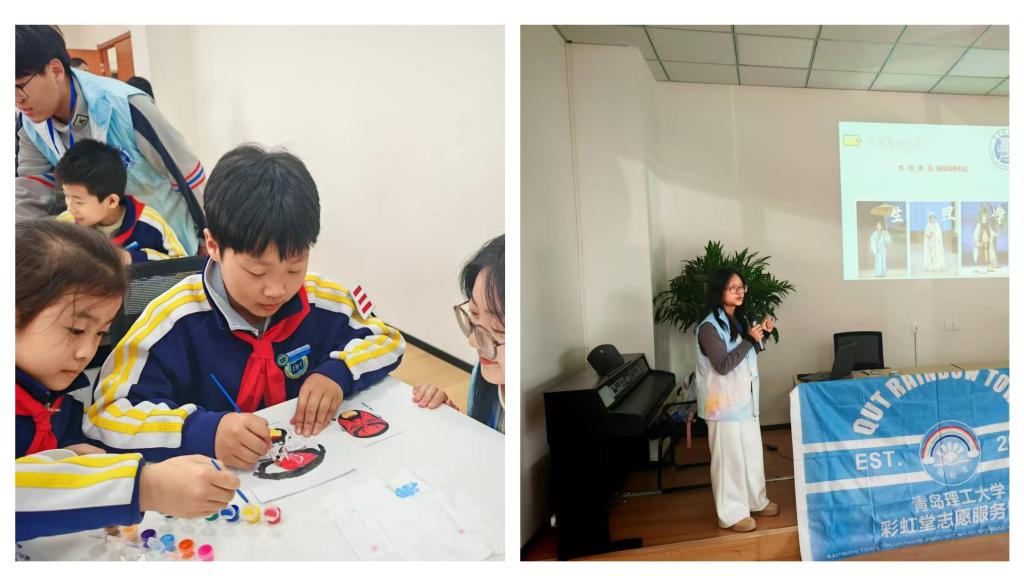 非遗传承,解码文化基因。《戏曲脸谱小传人》环节构建了传统文化体验矩阵。通过多媒体展示、知识竞答、纹样解谜等环节,志愿者系统讲解了非遗技艺的历史渊源与艺术特征,激发孩子们对非遗文化的兴趣。色彩侦探游戏和图案解谜挑战环节,孩子们通过竞猜颜色含义、观察脸谱纹样,深入了解传统文化。在实践环节,孩子们分组完成“角色定位一线稿勾勒一色彩填充一细节刻画”的完整创作流程。活动现场涌现出多幅兼具传统韵味与个性表达的佳作,部分作品在色彩运用上展现出专业敏感度,更有创新性设计突破了传统范式。活动结束时,不少孩子仍围在展板前讨论。“在传统的勾脸技法中加入了星星和银河元素,志愿者哥哥说这也是创新”“原来我爷爷会做泥塑,这也是非遗!”的对话此起彼伏。这种“传统文化接力赛”,让一颗颗文化传承的种子在童言稚语中悄然萌芽。