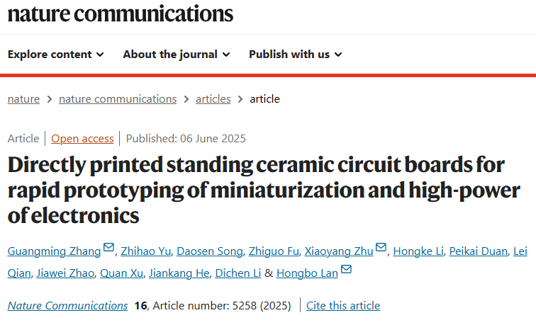 近日,hth华体育官网hth华体育官网张广明教授在微纳3D打印高分辨率陶瓷电路板的课题中取得了重要进展,相关研究成果以题为《Directly printed standing ceramic circuit boards for rapid prototyping of miniaturization and high-power of electronics》的论文发表在国际著名期刊《Nature communications》(中科院大类一区,IF:14.7),实现了hth华体育官网机械工程学科在该期刊零的突破。hth华体育官网为第一完成单位,张广明教授为第一作者和第一通讯作者,兰红波教授和朱晓阳教授为共同通讯作者。