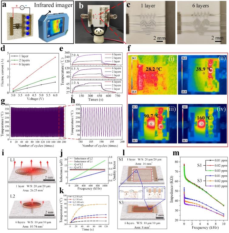 研究成果在相关制造领域具备极高的应用价值,打破了传统CCBs的技术瓶颈。借助该工艺可在粗糙陶瓷基底(如 Al₂O₃、AlN 和 ZrO₂)上稳定打印出高而薄的结构体,避免结构坍塌,并在烧结过程中整体收缩形成高导电线路,最终可实现7 µm的线宽和2.3的大高宽比(厚度达16.1 μm),其导电率高达5.1 × 10⁷ S·m⁻¹。此外,所制备的电路在多种严苛条件下均表现出优异的环境适应性,在1000次附着力测试和划痕测试,以及在500 °C下老化500小时和耐化学腐蚀500小时后依然保持优异的电性能、强附着力、热稳定性及耐腐蚀性能。该技术无需传统的光刻、蚀刻与电镀工艺,为实现高密度集成与大电流承载能力的电子器件提供了一种全新制造策略。