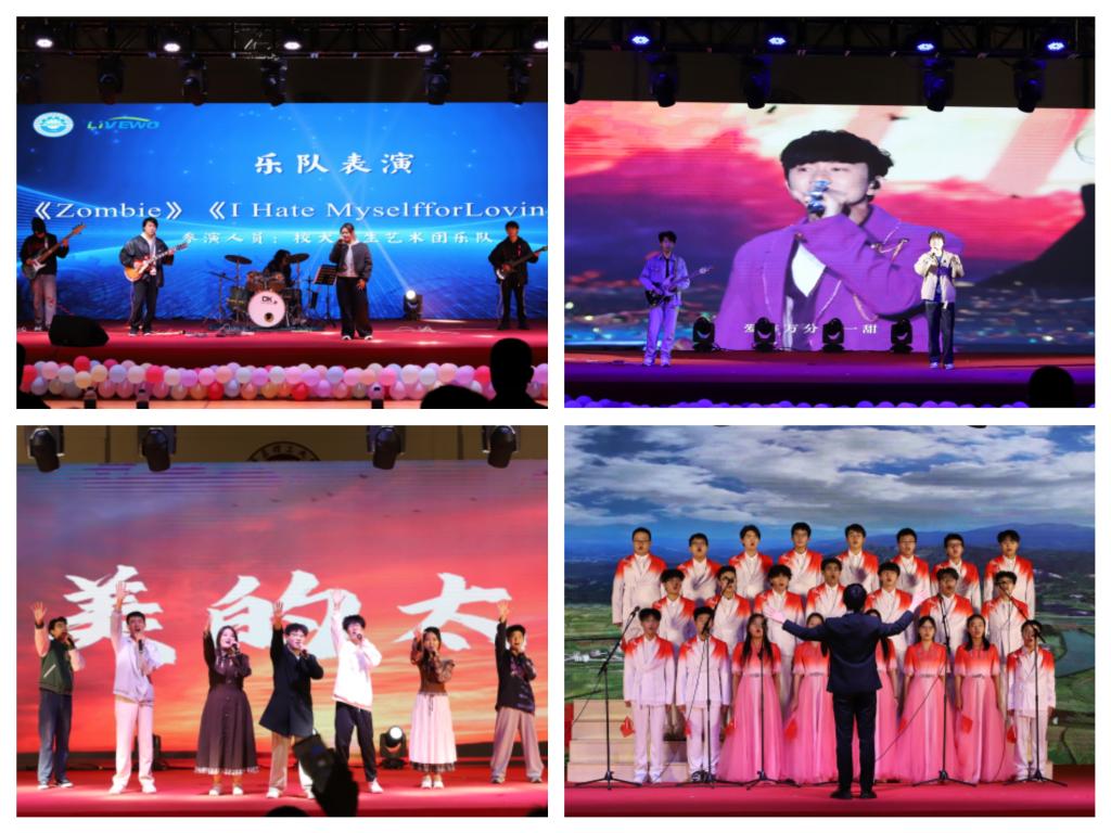 青春飞扬,共筑时代梦想。校大学生艺术团的乐队表演瞬间点燃全场;《落叶归根》《当你》等歌曲以动人旋律串起青春记忆,唱出新时代青年对家国的深情与对梦想的执着,掌声如潮,晚会气氛升至高潮。舞蹈《喜雨聆风》以柔美舞姿展现机车学子刚柔并济的品格;相声《卷王之王》幽默讲述大学生活趣事;最后,在合唱团《歌唱祖国》的嘹亮歌声中,华彩瞬间定格,晚会圆满落幕。