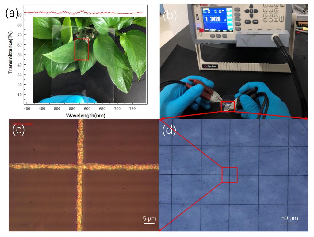 基于该方法,成功实现了超细、高性能(高透光率、高导电性)银网格透明导电膜的制备。