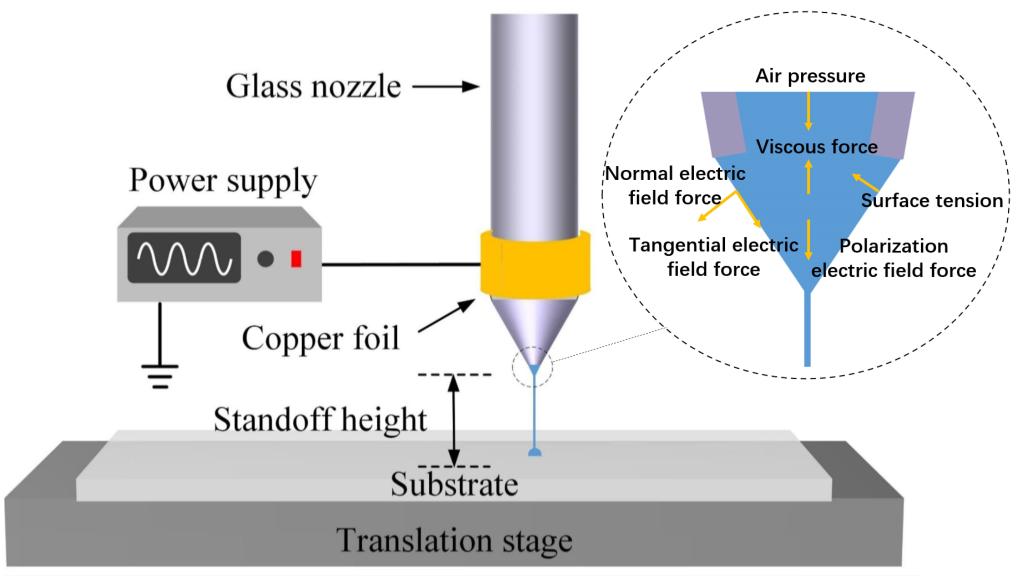 该研究针对传统电流体动力喷射3D打印必须使用导电喷嘴,并且在微纳尺度制造时由于残余电荷降低打印稳定性的难题,创新性的提出通过附加在绝缘打印喷嘴上的提取电极与绝缘衬底之间形成稳定电场,实现纳米银浆的稳定打印,提供绝缘喷嘴低成本使用的新思路。由此带来了诸多优势:一方面减少绝缘喷嘴喷金处理等相关实验成本,另一方面将电源与打印材料依靠绝缘喷嘴隔离开,仅依靠打印材料内部电荷完成打印,极大降低残余电荷对打印过程干扰。