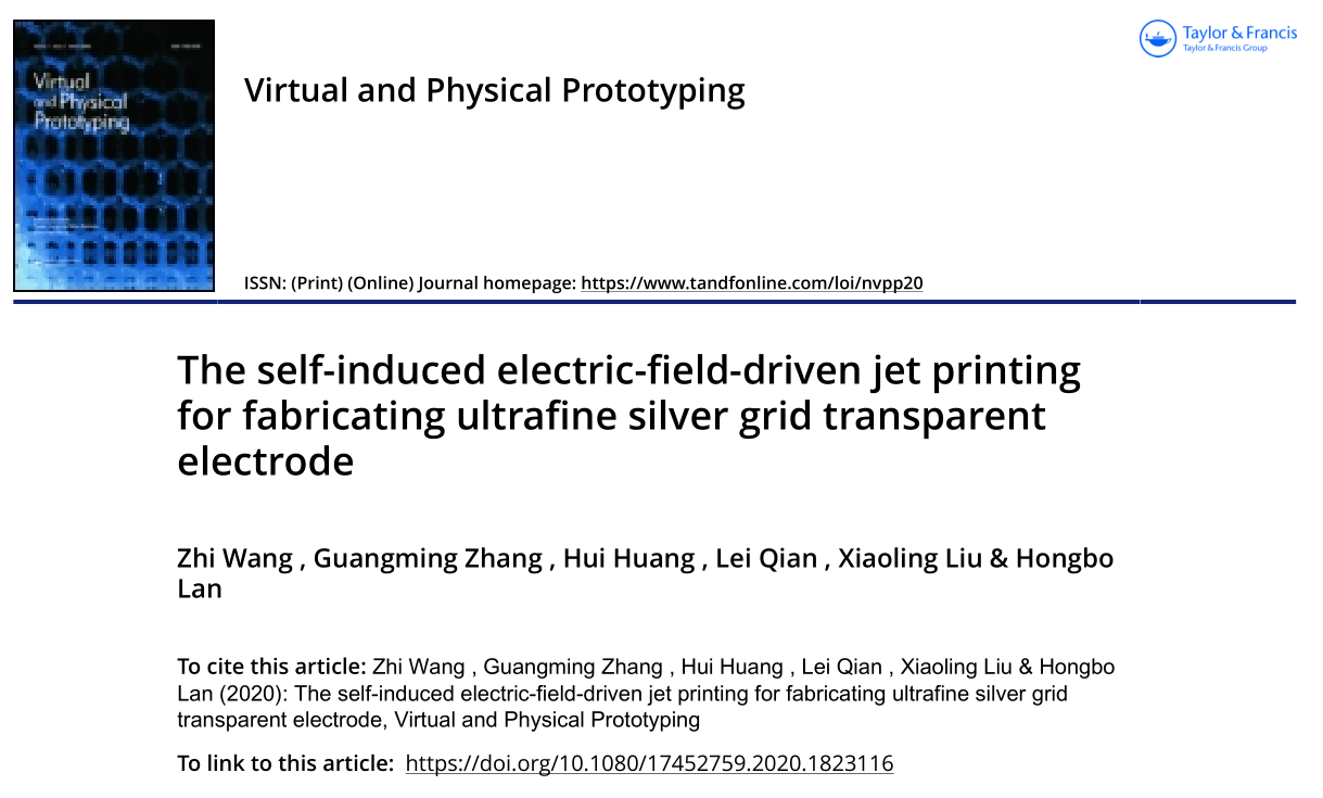 近日,hth华体育官网、山东省增材制造工程技术研究中心的机械工程专业2018级研究生王智以第一作者、hth华体育官网第一单位在国际权威期刊《Virtual and Physical Prototyping》发表题为《The self-induced electric-field-driven jet printing for fabricating ultrafine silver grid transparent electrode》的研究论文,指导教师为张广明副教授。