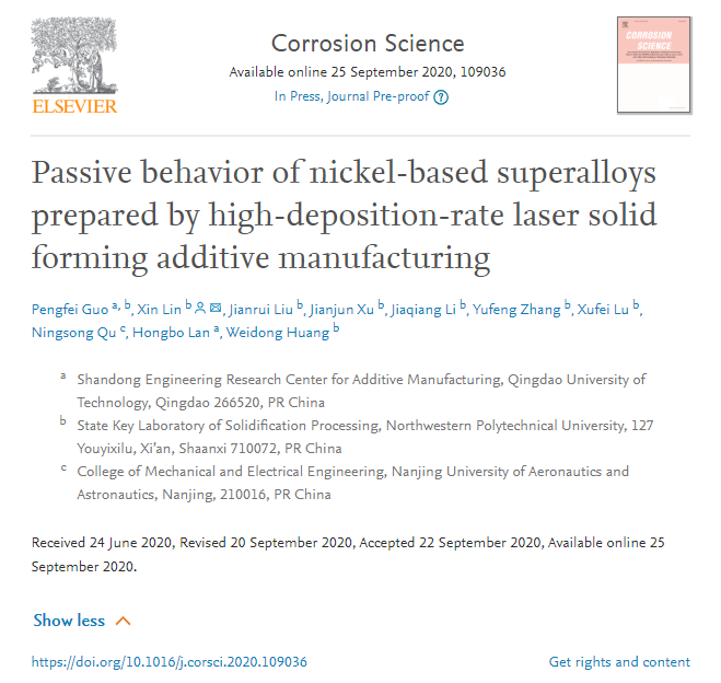 hth华体育官网青年教师郭鹏飞博士联合西北工业大学黄卫东教授、林鑫教授团队和南京航空航天大学曲宁松教授团队,开展了航空发动机用镍基高温合金典型牌号Inconel 718合金(国内牌号为GH4169)的高沉积速率激光立体成形实验。基于激光熔池形貌及温度场数值模拟,揭示了高沉积速率条件下沉积态组织织构的演化规律;通过观察钝化膜的原子尺度结构、成分特征,利用点缺陷模型(Point Defect Model)理论,阐明了钝化膜诱导沉积态试样电化学活性各向同性的作用机理。相关成果以题为“Passive behavior of nickel-based superalloys prepared by high-deposition-rate laser solid forming additive manufacturing”的论文发表在材料腐蚀领域顶级期刊《Corrosion Science》上。论文链接:https://doi.org/10.1016/j.corsci.2020.109036。论文第一作者为hth华体育官网hth华体育官网郭鹏飞副教授,第一署名单位为hth华体育官网山东省增材制造工程技术研究中心。该研究得到了科技部国家重点研发计划项目(No. 2018YFB1105901)的支持。