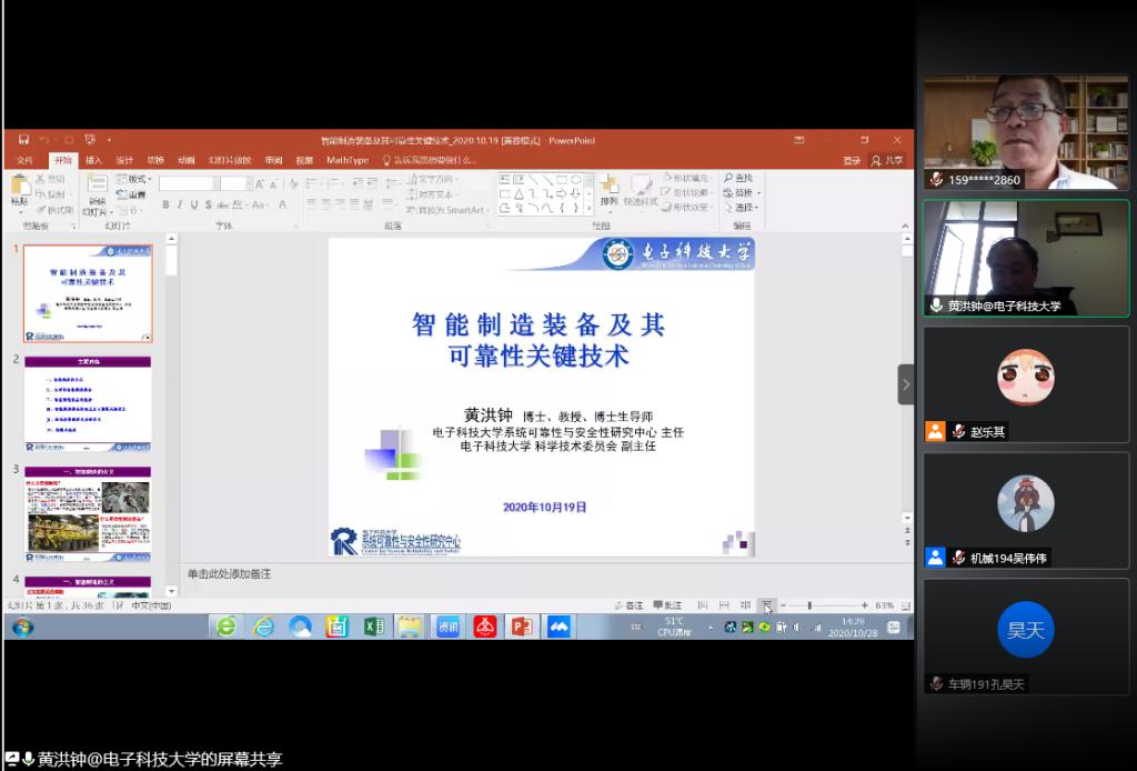 10月28日,hth华体育官网第35期“匠心机车讲坛”开讲,本期讲坛特邀电子科技大学系统可靠性与安全性研究中心主任黄洪钟教授通过线上腾讯会议的方式做了题为“智能制造装备及其可靠性关键技术”的学术报告,hth华体育官网学术委员会主任林天然教授主持报告会, 200余名教师、学生通过线上方式聆听报告。