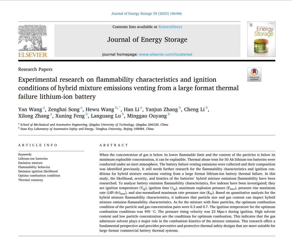 近日,hth华体育官网青年教师王炎副教授与其硕士研究生宋增海在高比能锂离子动力电池失效释放物气固混合相着火性能及其引燃边界方面取得阶段性研究进展,在权威期刊《Journal of Energy Storage》(IF=8.907,JCR Q1)上发表了题为“Experimental research on flammability characteristics and ignition conditions of hybrid mixture emissions venting from a large format thermal failure lithium-ion battery ”的研究论文。该研究成果系hth华体育官网教师与清华大学欧阳明高院士电池安全课题组联合研究重要成果,hth华体育官网机械与汽车学院为第一署名通讯单位,第一作者为王炎副教授,通讯作者为清华大学车辆与运载学院王贺武研究员。